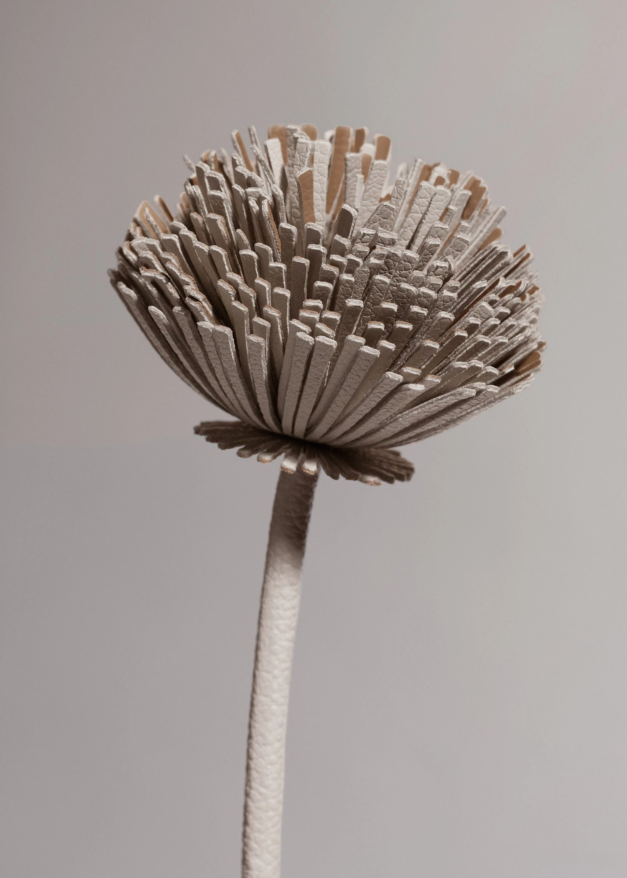 Die aus der Kollektion Plèi hervorgegangene Blume „Tul“, die zu 100 % aus upgecycelten Lederresten besteht, zeichnet sich durch ihre luftige Gestaltung aus. Ihre Blütenblätter aus zweifarbigem Leder werden in speziellen Formen angefertigt. Die Verbindung zwischen den zwei lederbezogenen Stielen ist von einem langen gerippten Blatt umgeben, das mit zarten Stichen von Hand vernäht ist. Die Blume bezaubert einzeln, kombiniert mit anderen Lederblumen oder in einem Strauß aus Trockenblumen. Der Name „Tul“ spielt auf die luftig leichte Wirkung an, die durch das übereinanderschichten der fransigen Blütenblätter entsteht.